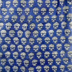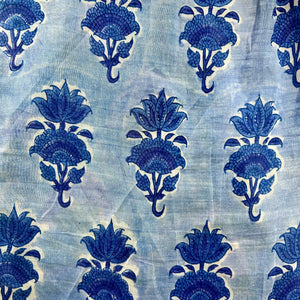 Woman wearing a blue floral dress indoors